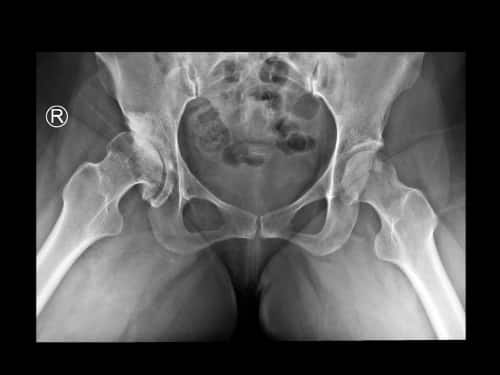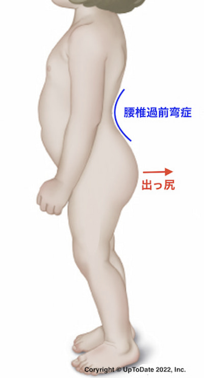 両側に脱臼がある場合、大腿骨頭が後方に脱臼するため、骨盤が前に傾いてしまいます。それを代償するために腰椎が弓なりになる(腰椎過前弯)ので、腰の部分が深く凹み、お尻が出っ張ります。