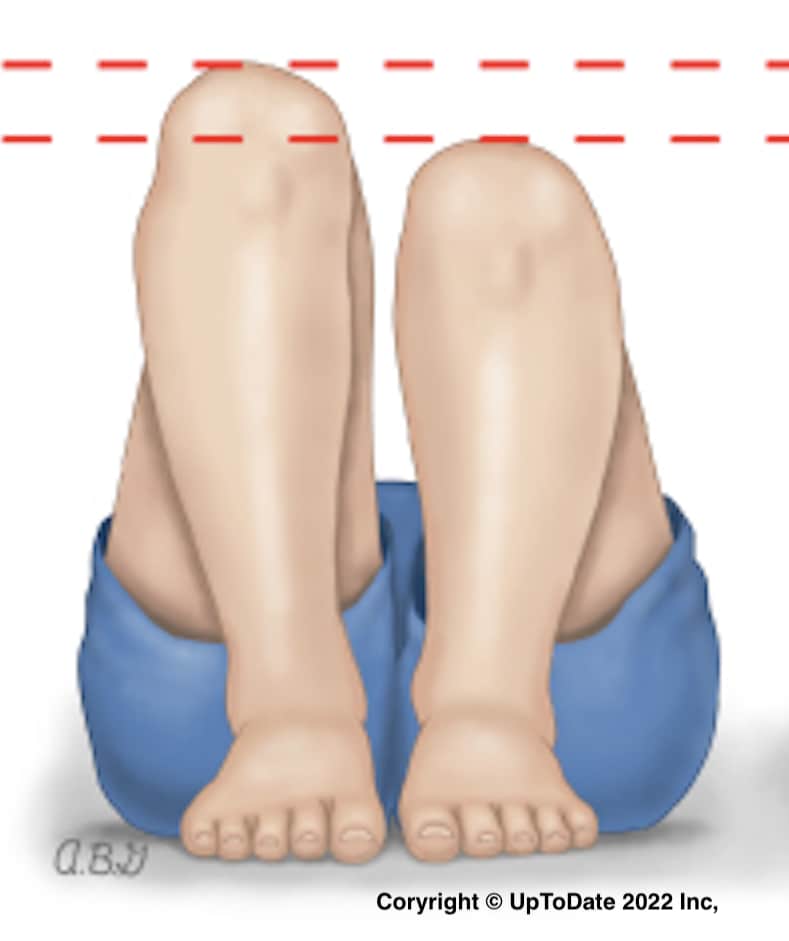 股関節の開きにくさ(開排制限)を調べます。両膝を合わせた状態からゆっくり開いていきます。女児 80度、男児 70度以上開くのが正常です。開きが悪いときには脱臼の可能性があります。女児は関節が柔らかいので脱臼があっても開排制限がないこともあります。