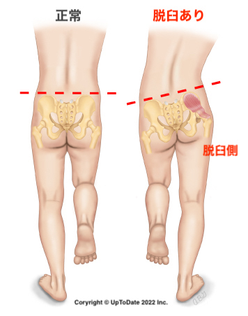 右の脱臼なら左が下がり、両側の脱臼なら左右の立っている足の反対側の腰が下がります。