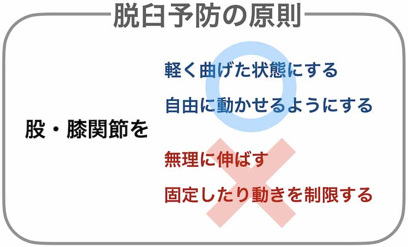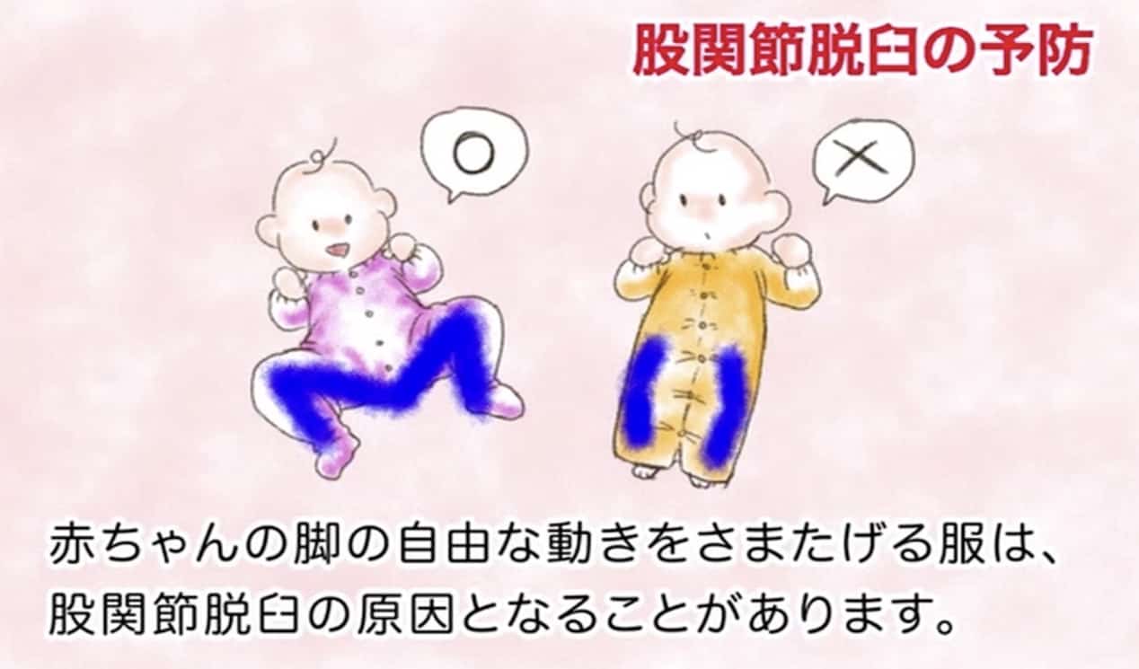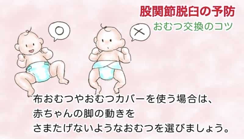 三角/巻おむつではなく股おむつを使って、脚が自由に動かせるようにしましょう。M字型に開けるようにして、伸ばされた状態で固定しないようにしましょう。股関節を開くために、二重おむつで無理やり開いて固定するのは逆効果です。