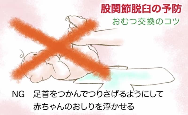 便漏れを防ぐために両サイドのテープの幅が広いものがありますが、これをきつく止めると股関節を伸ばした状態で固定されてしまうので、サイドテープの幅は狭いものを選び、きつく締めないようにしましょう。おむつ交換の時には、足先から持ち上げるのではなく、お尻の下に手を入れて持ち上げるようにしましょう。