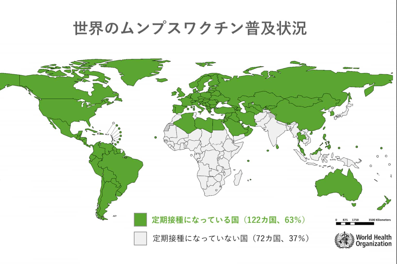 非常に効果が高く安全なワクチンですので、WHOは2回接種を推奨しています。欧州・南北アメリカ大陸では100%、全世界でも約60%の国で接種が義務づけられています。先進国で定期接種になっていないのは日本だけで、欧米ではすでに過去の病気となりつつあります。